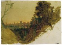 Vigorously painted sketch with a tree in the right foreground and a view downhill to Tivoli. Buildings can be seen in the distance.