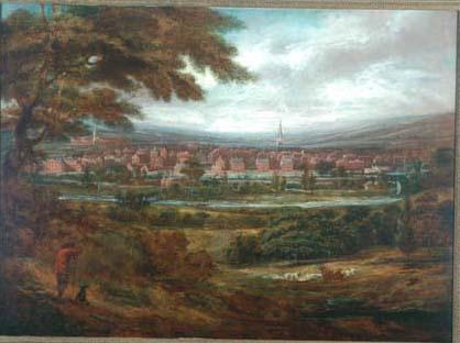 The view, painted from rising ground to the south-east, stretches over the river Calder towards the town. In the foreground a man and his dog stand looking towards the town while cattle and sheep graze peacefully. Near the centre of the painting is the parish church, now the cathedral, surrounded by the brick Georgian buildings characteristic of I8th century Wakefield. Beyond the town we can see the low hills of the Alverthorpe valley. Wakefield Art Gallery is currently closed and will open in 2011 as The Hepworth Wakefield.
