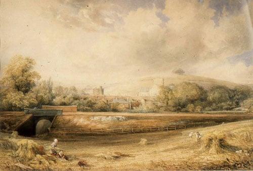 Prosser's watercolours of Winchester, dating from the 1850s-1870s, afford a comprehensive coverage of all the historic buildings and many street scenes of the period. This painting shows the recently constructed St Cross Hospital from the west side of the railway line with St Catherine's Hill in the background. It must be one of the very earliest views of the Southampton line, perhaps shown still under construction to judge from the pile of stone blocks shown on the embankment.