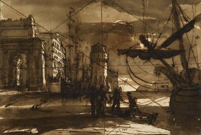 View on a quay with figures at the centre near a rowing boat and part of a ship visible on the right. In the background, we can see an arch, lofty buildings and a lighthouse. Previously titled 'View of Seaport or Seaport at Sunset'. Part of an album of drawings belonging to Lord James Cavendish MP (d 1741), son of the second Duke of Devonshire (1665-1729), founder of the great collection of drawings at Chatsworth. The collection of drawings form an interesting relic of the great age of collecting in England.