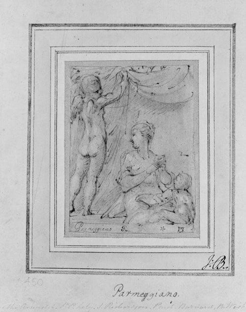 A copy of a lost drawing by Parmigianino showing the Virgin and Child with a winged boy holding a curtain.