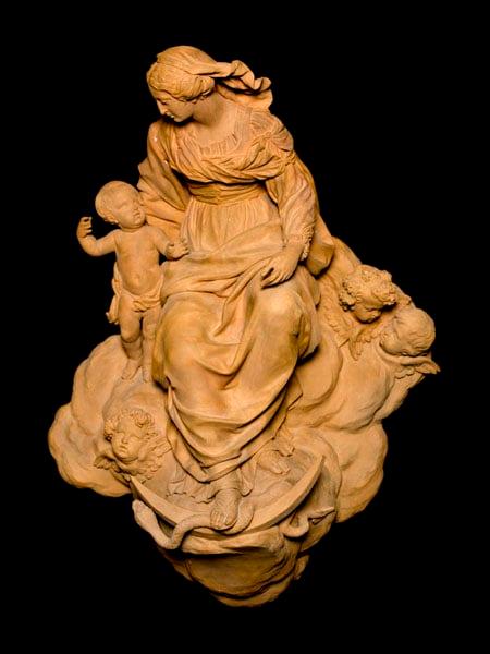The graceful Madonna is seated on a bank of clouds with emerging winged cherub's heads on either side. She looks tenderly downwards towards the Christ Child who stands beside her and places her arm protectively behind him. It was the model for a larger wood carving in the church of St Martin's in Heers, Belgium.