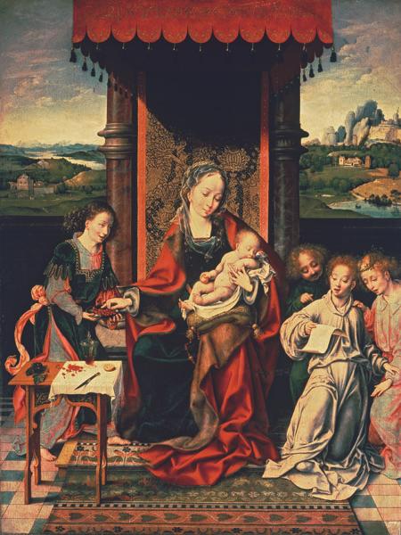This painting is one of the undisputed gems of the art gallery. It depicts three angels serenading the Christ Child, who holds an apple, fruit of salvation. On the left, another angel offers the Virgin a bowl of cherries, symbol of the delights awaiting the blessed. On the table is a carafe of wine and bunch of grapes - both Eucharistic symbols - together with some cherries, a knife and half a lemon. The inscription on the canopy derives from the Song of Solomon (4:7; 6:3) and is a reference to Christ's love for the Church. The picture originally had an arched top and probably formed part of a small triptych. Other artistic influences are evident in the landscape background, reminiscent of the contemporary artist Joachim Patinier, also active in Antwerp. The ecstatic expression and wavy hair of the angel at the left and in the delicate shading employed throughout the picture recalls the paintings of Leonardo.