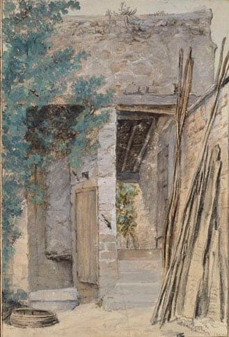 On the right, adjoining a stone outhouse, is a short covered passage approached by several steps and leading apparently to a garden beyond. On the left, is the entrance to the outhouse partly overgrown with foliage. Leaning against a wall, in front on the right, are a number of beams and sticks. One of 8 gifts to the Ashmolean, Fitzwilliam and Wallace Collection by F A Drey through the Art Fund between 1938 and 1943.