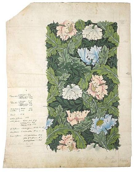 This is a very finished design, with technical annotations, for the ‘Wreath’ wallpaper depicting poppies and acanthus flowers. The V&A already has a sample of the printed wallpaper, as finally manufactured, but in a different colourway. The V&A, which includes the national collection of designs, holds numerous objects and works on paper by William Morris and by the firm of Morris and Company; these include several designs for textiles. This design is later in date and style to the existing holdings and clearly shows a near final stage in the design process before manufacture takes place.