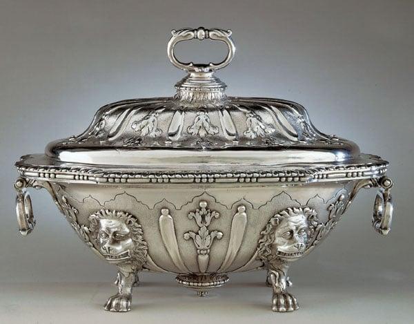 A soup tureen and lid on four legs. Each leg is in the shape of a paw with a lion or leopard's head above. The tureen is one of the few surviving pieces from a considerable amount of silver supplied to Sir Robert Walpole for Houghton Hall, Norfolk.