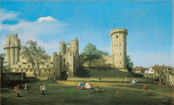 Painted in 1752, after the artist's trip to Venice, it depicts the exterior of Warwick Castle with a glimpse of the old town to the right and topographically correct, a view notable for its animated and elegantly dressed figures and for the intense blue of the sky. Its Italianesque light adds a Mediterranean touch to a traditional English scene. Canaletto painted five views of Warwick Castle during his two visits to England in 1746-50 and 1751-55. This piece and its companion Warwick castle, the East Front from the Inner Court, were acquired by the American collector Paul Mellon in 1977 but their export license was withheld. Birmingham Museum and Art Gallery launched a national campaign to raise funding for their purchase.