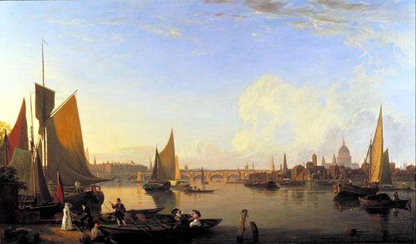View on the Thames, looking towards Waterloo Bridge. Waterloo Bridge was Rennie's masterpiece, and was opened by King George IV, when Prince Regent, on the 18th June, 1817. The opening event was depicted by Constable and David Cox.