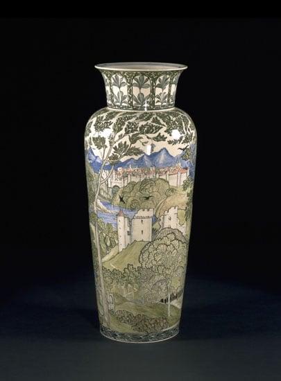 Cream coloured earthenware vase designed and painted by Alfred Powell with a romantic landscape. The potting was done by Josiah Wedgwood and Sons and it was thrown by Jack Shaw.