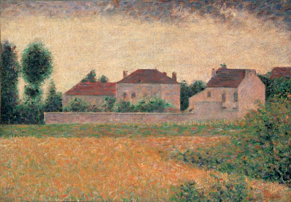 In this painting, Seurat focuses on a group of three houses behind a wall which are framed to either side with foliage. The foreground is divided into two rectangular bands, one yellow and the other green, coaxing a hidden geometry out of the entire scene. The façades of the buildings add further stark simplicity to the design as they have been flattened to make them more cubic. The blue band of the sky at the top of the picture echoes the rhythms of the foreground and wall, enhancing the harmony of the composition. His instinctual classicism is immediately apparent in this landscape, clearly done directly from nature.