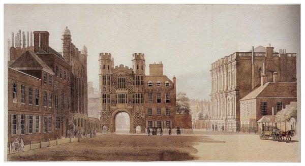 Whitehall before the demolition of Holbein's Gate. We can see a broad street with a group of soldiers standing by a sentry box on the left. There is an open gateway with view down the street and the Banqueting Hall beyond. The 'Holbein' Gate was built in 1532 and demolished in 1759. The Banqueting House is the only integral building of the old Whitehall complex now standing.