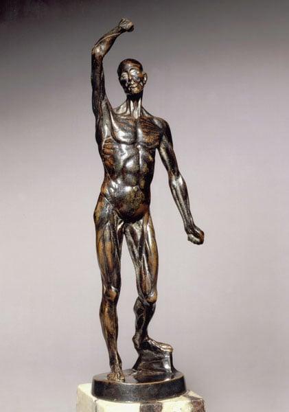 This work is a small-scale replica of a plaster cast of a flayed criminal which Dr. William Hunter made in the 1750s to aid his lectures to the Incorporated Society of Painters, and subsequently the Royal Academy. This statuette was made from a figure in wax which Hunter had previously acquired.
