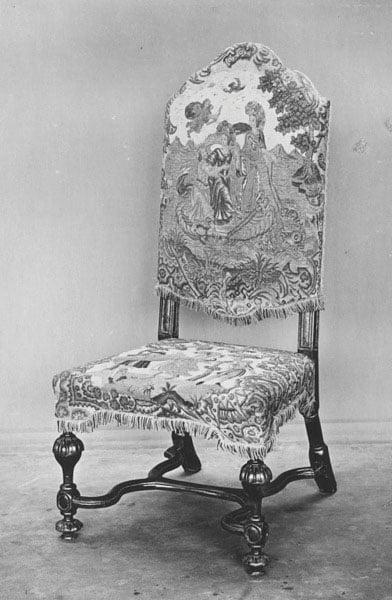 Chair of carved walnut, back and seat stuffed and covered with petit point needlework in silk and wool. The embroidery on the back represents Poseidon and Galatea in a chariot. Trimmed with a fringe. The legs are elaborately carved.