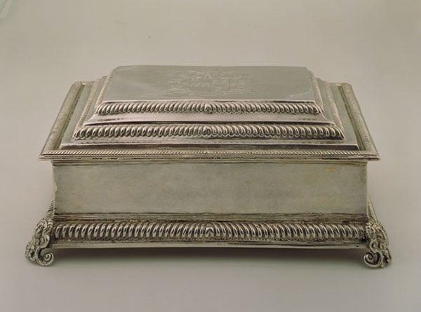 The plain surface of the lid of this casket is engraved with contemporary armorials of Thompson impaling Wilmot below a scrolling foliate mantling. The casket was used for jewellery.