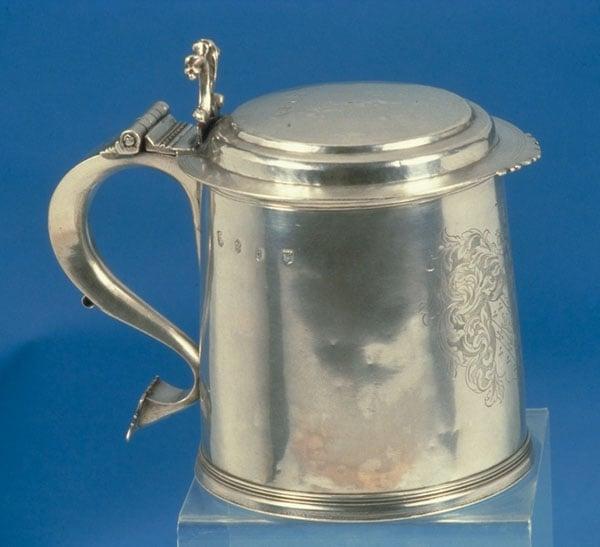Apart from a paten and cup, this tankard is the only piece of Norwich silver with the date letter A for 1701 and the Britannia or new sterling mark introduced in 1697. It also has a lions head and the makers mark HA for Haves, Haselwood, Hartsonge or Harwood. These three pieces were the last to be struck in Norwich because the assay office closed in 1701. The tankard has a rim foot, a scroll handle and a flat-topped stepped hinged cover and corkscrew thumbpiece.