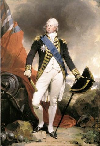 A portrait William IV, when Duke of Clarence, portrayed in naval uniform, standing on the seashore holding his hat and sword.