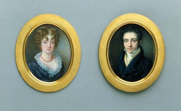 Pair of portrait miniatures. Only known portrait of William Morris Senior (1797-1847) and the earliest known portrait of Emma Morris (nee Shelton) (1805- 1894), were painted two years before their marriage. Possibly painted by two different artists.