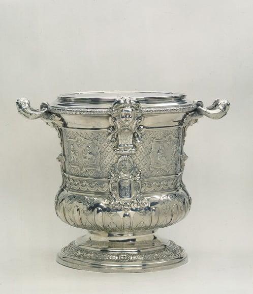 One of a pair of wine coolers or ice pails commissioned by George II as part of the ambassadorial silver of Philip Stanhope, Earl of Chesterfield. Unusually heavy, elaborate in decoration and with early figurative chasing. Britannia hallmark 1727-8.