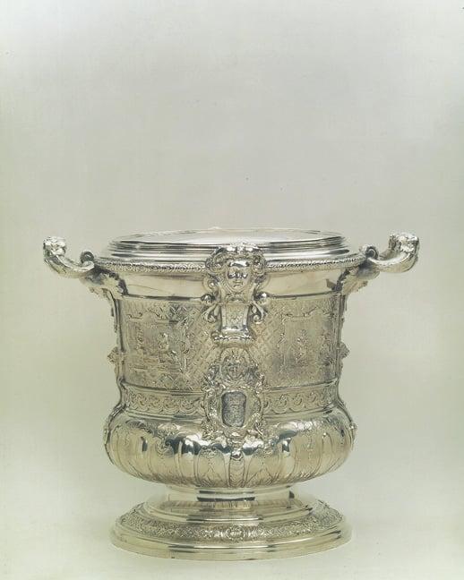 One of a pair of wine coolers or ice pails commissioned by George II as part of the ambassadorial silver of Philip Stanhope, Earl of Chesterfield. The buckets are unusual in several respects; they are the earliest example of 18th century English silver to incorporate large areas of figurative chasing, an element which was to become more significant in the rococo silver of the 1730s; they are heavier than any of the other English coolers' and their decoration is more elaborate than almost any other cooler known today. This work was acquired with assistance from the Wolfson Foundation.