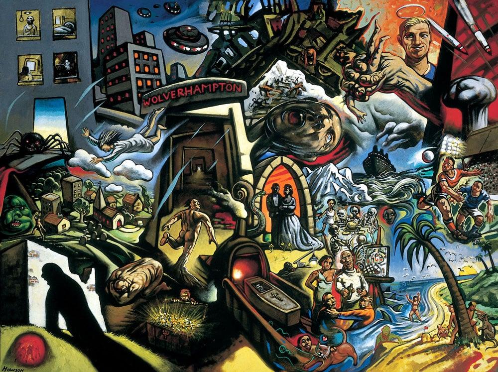 Montage of individual dreams painted in bright colours with heavy black outline. Images include a beach with palm tree, flying saucers, a figure falling through clouds, a wedding, a football scene and an idyllic village.