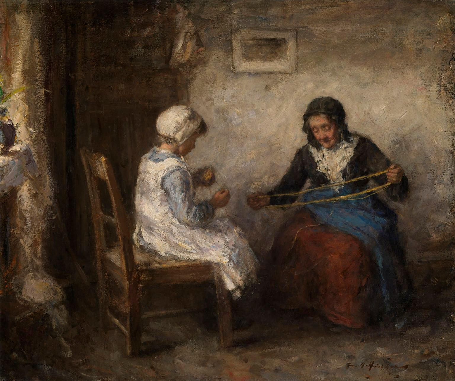 Rendered in muted colours with vigorous, impressionistic brushstrokes, this domestic scene typifies the style of Edinburgh-born painter Robert Gemmell Hutchison.