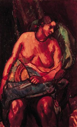 A nude study of a woman seated in an armchair and holding a fan in her left hand. She leans back against the chair and looks down towards her left. Drapery of blue and green lies across her lap and behind her head. Vera Cuningham, the model, was also the model for a whole series of Smith's most masterly paintings of this period. Sir Philip Hendy has called this 'one of the masterpieces of English painting; a heavy-weight champion, a tremendous monument of glowing flesh'.