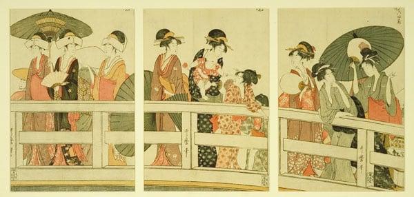 In this triptych, a group of elegantly dressed women, one holding a child, are loitering on the Ryogoku Bridge over the Sumida on a summer evening. They watch girls in pleasure-boats below, which are depicted in a companion triptych, which is meant to be placed below to form one large composition. Linking the two compositions is the balustrade of the bridge, its defiant geometry contrasting with the sinuous curves of the promenaders.