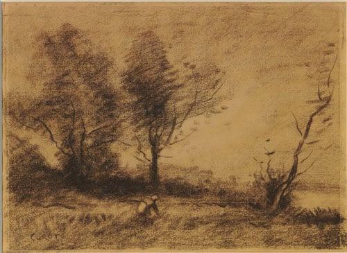 Landscape drawing in black chalk, a study for the 'Wood Gatherers'. This work is part of a long series of works of art from the collection of the late Henry Van den Bergh which have found their way to museums through the Art Fund at different periods since 1909, either being presented by himself, or, following his death in 1937, by his heirs. The Van den Bergh collection not surprisingly, was strong in the work of Dutch artists, particularly of the 19th century.