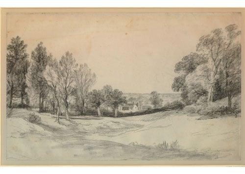 This characteristic example of Constable's landscape drawing in black chalk shows a wooded landscape, probably at Dedham. In its rhythm and large handling the work carries on the tradition of Gainsborough. It is full of light, and the subtly-graded half-tones are largely achieved by the use of the stump.