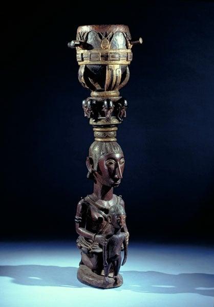Wooden drum consisting of figures and masks. Carved and painted and mounted on a pedestal. Probably from Yoruba in Southern Nigeria (West Africa).