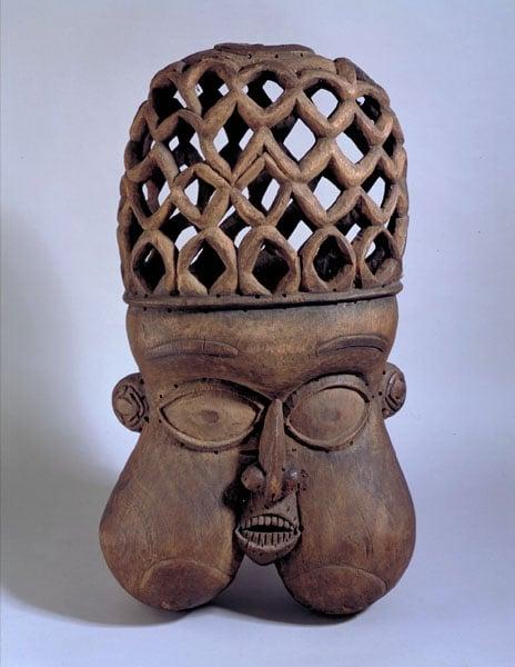 Mask with distended cheeks as used by the Bamileke and Barmum tribes of the grassland region in the interior of the Cameroons.