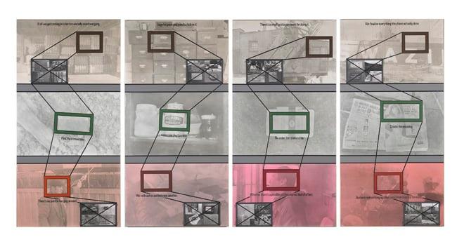 Perspex framed panels containing photographic prints, photographic dyes, Letraset, gouache & ink on card