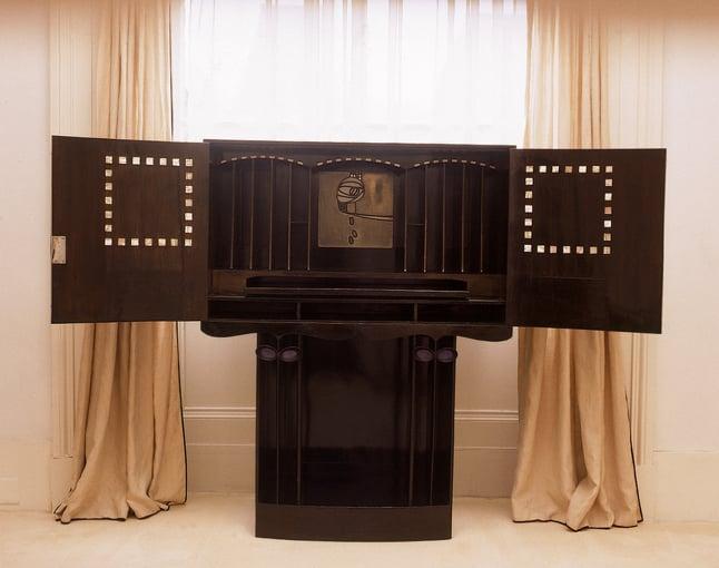 Dark stained wood decorated with lighter wood, coloured glass, ivory & mother-of-pearl. A panel with a leaded glass design of a stylised rose is let into the upper part of the desk.