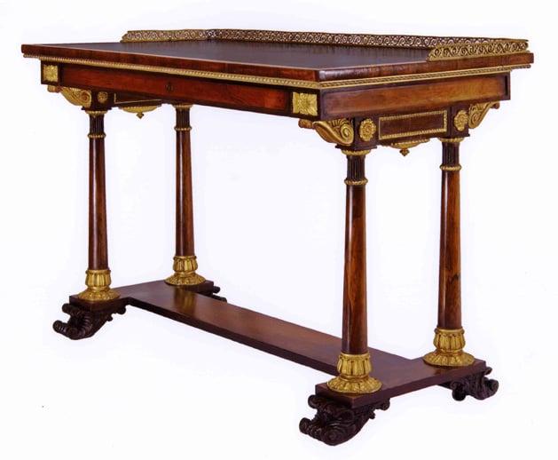 The table is an exceptionally fine example of Regency furniture of the late 1820s, with characteristic features of the royal furniture suppliers. The south wing of Temple Newsam has recently been restored to the decorative scheme of the 1820s installed by Lady Hertford, George IV's principal confidante from 1806-1819. The table was once owned by Earl Grey who was critical of Lady Hertford's influence over the King. Ironically Earl Grey's granddaughter Emily Charlotte Wood married Lady Hertford's great-nephew Hugo Francis Meynell Ingram and Emily became outright owner of Temple Newsam for 33 years after her husband's death.