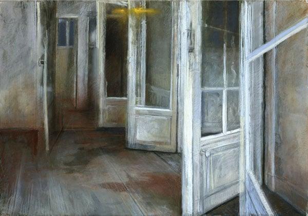 Ra’anan Levy was born in Jerusalem in 1954 to Syrian-Jewish parents, themselves first generation emigrants. Their cultural displacement took its toll on Levy’s own identity; as a second-generation refugee he describes himself as feeling like a ‘stranger’ in Israel; his identity ‘more Jewish than […] Israeli’. Yellow Light depicts an empty domestic interior. In its devoted attention to a scene consisting solely of ordinary objects – doors, floorboards, window panes – combined with an unexplained glimmer of yellow light emanating from an unknown source, it draws the viewer’s attention towards the tension between the inanimate and the animate that fills an apparently empty room. A fine coating of dust (a collection of dead skin cells) covering the floorboards testifies to a past inhabitant, emphasising – along with the open doors – the room’s currently deserted state, and imbing the scene with a sense of nostalgia (in this domestic case, a literal aching for ‘home’).