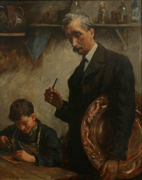 This large oil sketch shows Johnny Payne Cotton beating copper under the watchful eye of John D Mackenzie. Forbes was the founder of the Newlyn School which had close links with the Copper-workers school. The classes were established to give the local young men instruction in a craft that would provide them with an occupation to replace the jobs that had disappeared with the decline of the Cornish tin and copper mining industry.