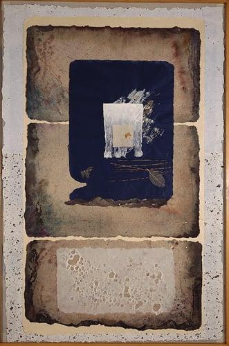 `The title is taken from a line from a poem by Faiz Ahmed Faiz, Pakistani's most revered poet. The work contains an eponymous actual skeletal leaf, its delicate tracery completely in tune with the calligraphic gesture contained in the work.`