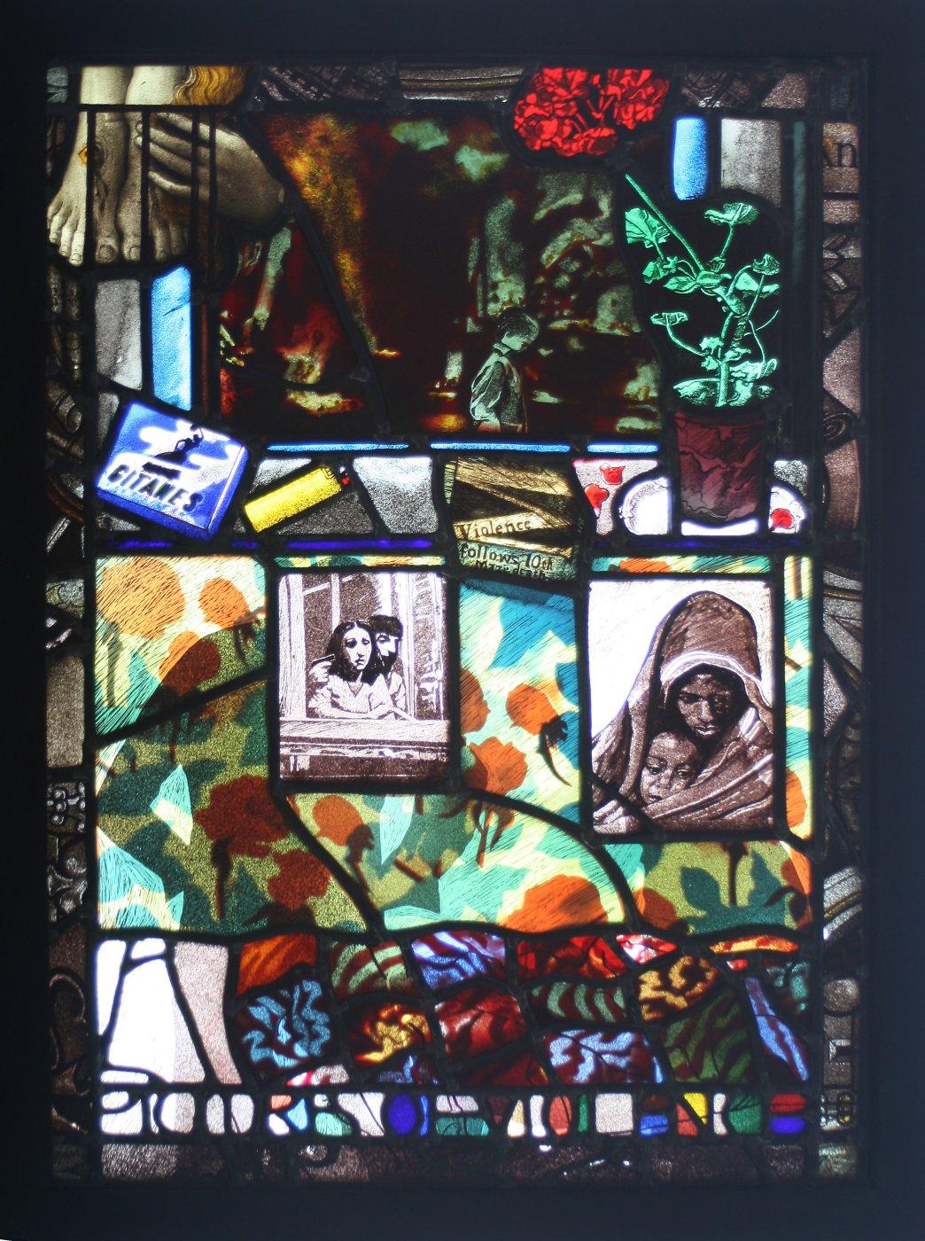 Richly layered in colour, imagery and meaning, Pictures of Violence by Rosalind Grimshaw is a stained-glass work depicting scenes of violence from significant 20th-century events, including The Troubles in Northern Ireland, the widespread famines in Ethiopia and the Iran hostage crisis. The border is made of recycled fragments from 19th- and 20th-century church windows shattered by an IRA bomb. An image of Christ’s feet nailed to the cross can be seen in one of these pieces.