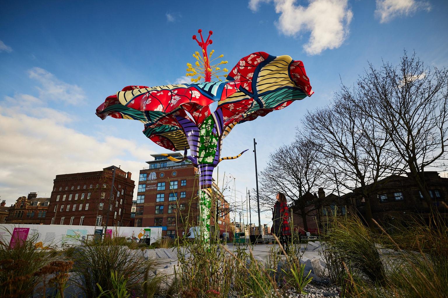Hibiscus Rising is a 9.5-metre recreation of a hibiscus flower, a plant common in Nigeria, where Shonibare grew up and where Oluwale was born before moving to Britain. Shonibare has embellished the sculpture with multicoloured designs inspired by batik patterns in a nod to African identity and cultural heritage. It was also inspired by Maya Angelou’s poem Still I Rise, which explores overcoming adversity in the face of racism. The resulting artwork has created a public space in the city where the local community can come together, to grow and to heal.