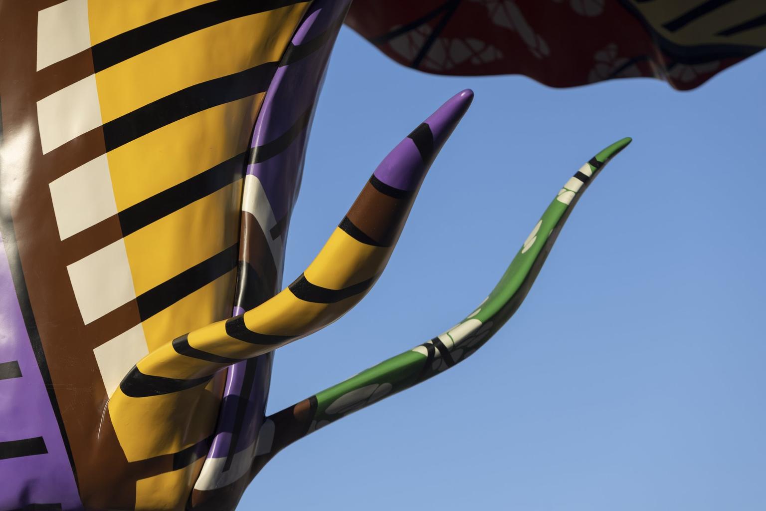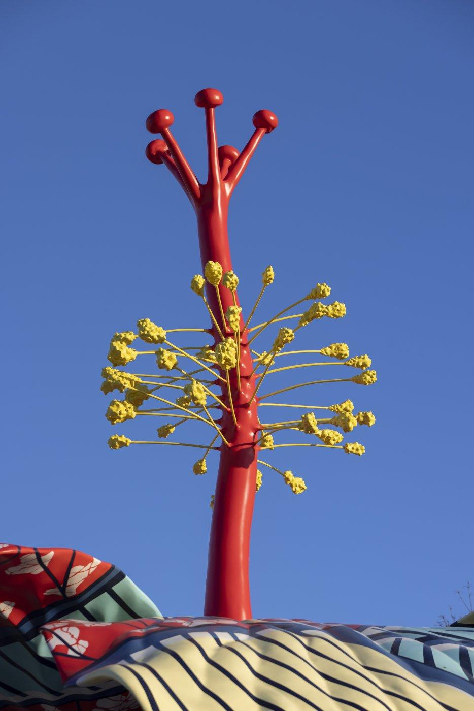 Embellished with his signature patterns, Yinka Shonibare’s sculpture Hibiscus Rising takes the shape of a monumental hibiscus flower, its petals reaching towards the sky.
