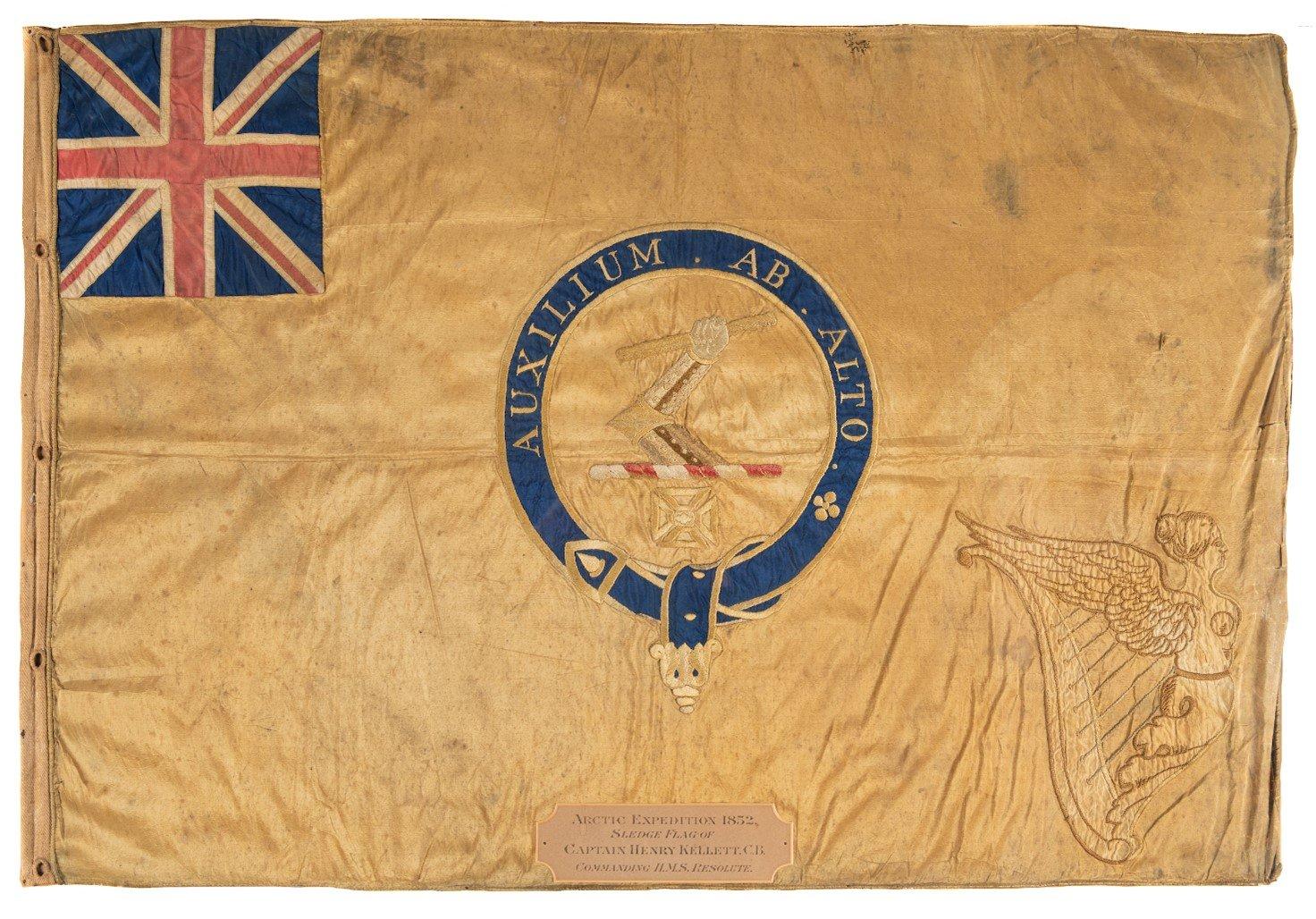 During his 1852 Arctic expedition as commander of HMS Resolute, Captain Henry Kellett flew this silk flag from his sledge. He was on a mission to find traces of Sir John Franklin's doomed expedition of 1845 to find a northwest passage. The embroidered motto ‘Auxilium Ab Alto’ translates as ‘Help From Above’, and the gold-threaded harp references Kellett’s Irish heritage. The background would originally have been a rich green colour.