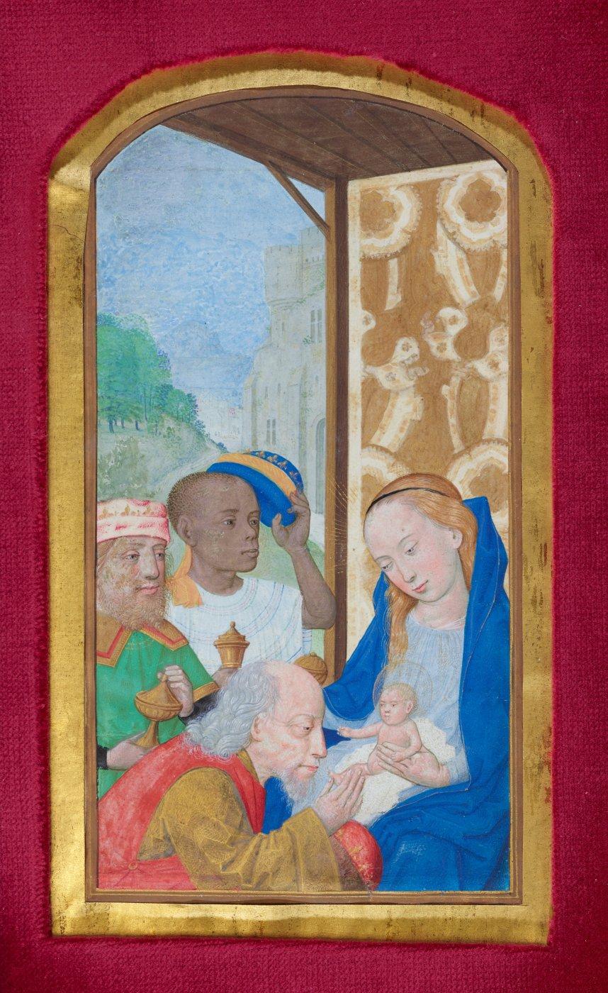The Adoration of the Magi (pictured above) and The Elevation of the Host are two exquisite miniatures taken from the pages of the Hours of Louis Quarré, a lavishly illustrated 15th-century prayer book. The removal of the miniatures from the book is dated between 1816 and 1832, when collector Francis Douce bought the book, which he then bequeathed to the Bodleian Library collection. The framed miniatures have been in private hands since that time.