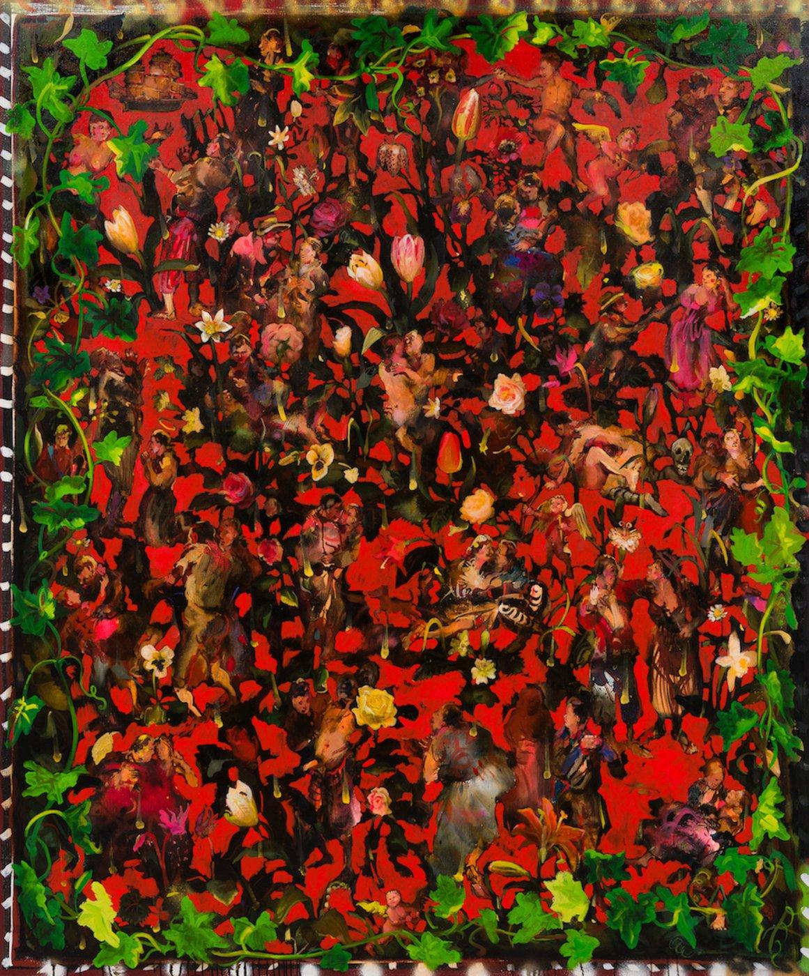 Nicola Bealing’s bawdy canvas Joyful News to Bachelors and Maids is littered with lusty couples frolicking between luscious flowers and mischievous cupids. The painting is inspired by a ballad of the same title written in 1741 to poke fun at the newly opened Foundling Hospital, suggesting it would serve to encourage promiscuity.