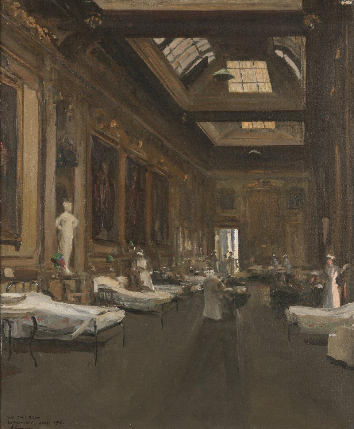 John Lavery’s painting The Ball Room at Londonderry House is an impressionistic record of an aristocratic London mansion in use as a military hospital during the First World War. It shows nurses attending wounded soldiers in a palatial ballroom, with portraits and statues.