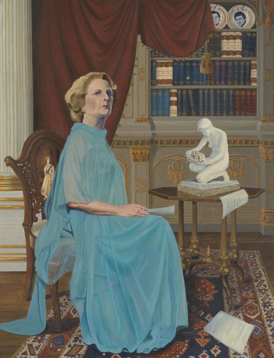 The painting shows Margaret Thatcher in the style of a Victorian society portrait and makes connections between her free-market policies and the art world of the time. In the cracked plates on the bookcase appear the faces of Charles and Maurice Saatchi, the advertising gurus who created election campaigns for Thatcher. Charles was also an art dealer and on the committee of Tate and the Whitechapel Gallery, two positions he resigned from when this work was exhibited.