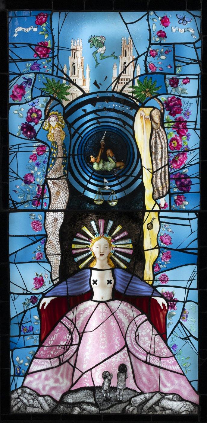 Acknowledging that the ‘beauty of stained glass allows you to talk about the ugly’, Pinkie Maclure combines literary, mythological and art-historical references with recognisable images to create visually appealing stained-glass works that invite discussion. Beauty Tricks speaks directly to contemporary issues around body image, fashion, surgical modification, the beauty industry, capitalism and the environment.